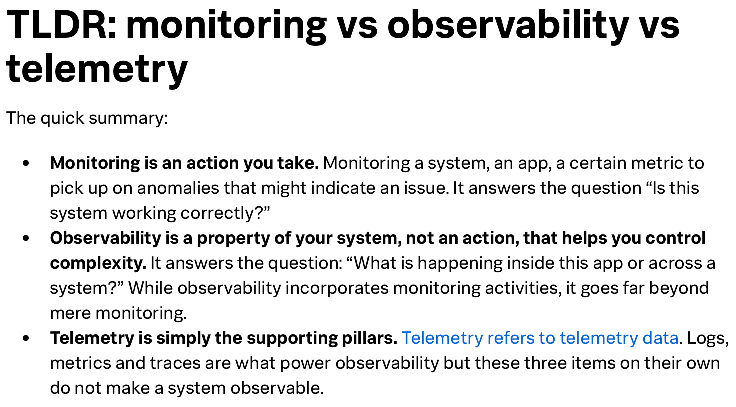 Telemetry, monitoring, and observability. Lacking any one of these results in an incomplete picture. Here’s a formal definition that I think ties them together: