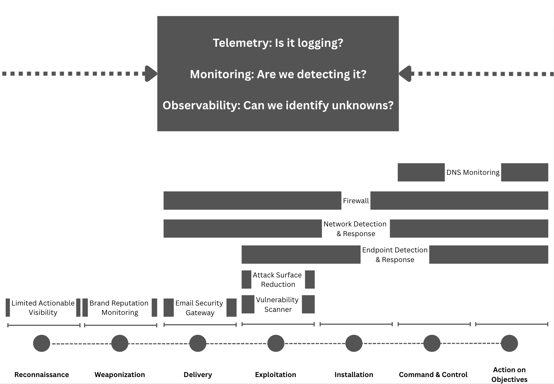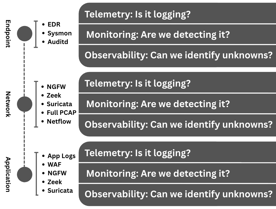 - Endpoint: Are we collecting the right telemetry, actively monitoring it, and do we have the observability to investigate unknowns?